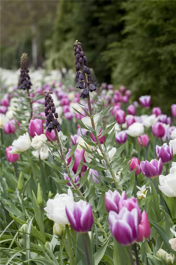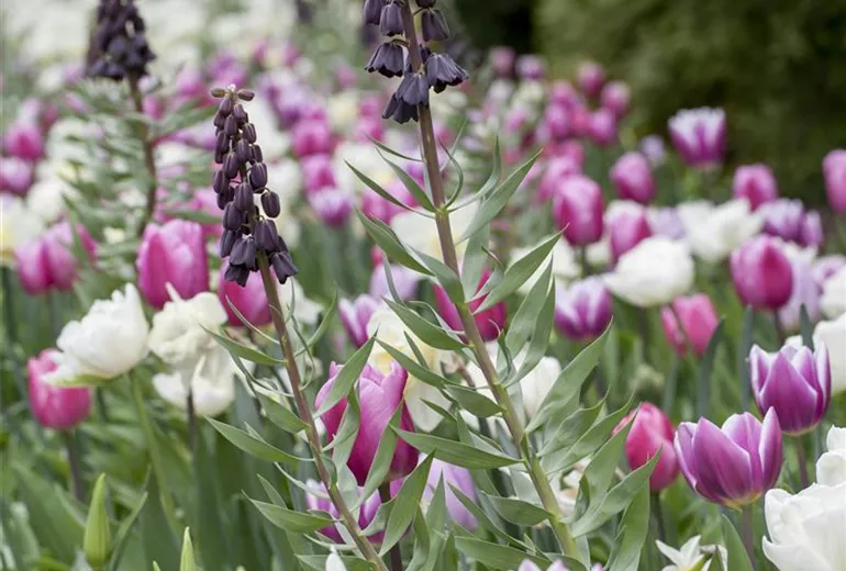 Typische Frühlingsblumen sind Narzissen und Tulpen. Zu ihnen passen Stauden, die mit ihrem Blätterkleid zunächst einen unauffälligen Rahmen bilden, bis sie die vergilbenden oder sich zurückziehenden Blätter verdecken. Wenn die Stauden nach der Blütezeit der Blumenzwiebeln auch noch selbst blühen, umso besser! So ist Ihnen immer Farbe in Ihrem Garten vergönnt. Narzissen passen sehr gut zu Funkien. Beide wachsen auf schwerem, nährstoffreichem Boden. Tulpen reagieren empfindlicher auf Nässe als andere Blumenzwiebeln. Ihnen macht man mit trockenen, sonnigen Standorten eine Freude. Deshalb sollte man sie nicht neben Prachtstauden setzen, die womöglich zusätzlich gegossen werden müssen. Als geeigneter Pflanzpartner bietet sich das Purpurglöckchen an. Zierlauch wiederum wächst sehr hoch hinaus, ihn ergänzen Steppenkerzen sehr gut.